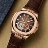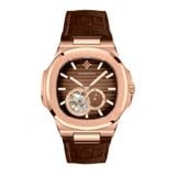 Vẫn giữ vững ngôn ngữ thiết kế Octagonal (bát giác) mạnh mẽ với những đường vát cạnh sắc sảo, 6312R/08 tạo nên một cấu trúc vỏ vững chãi và đầy nam tính. Lớp mạ PVD vàng hồng (Rose Gold) không chỉ mang lại vẻ ngoài lộng lẫy mà còn có độ bền màu vượt trội theo thời gian. Sự tương phản giữa bộ vỏ kim loại sáng bóng và dây da nâu dập vân cá sấu thủ công giúp chiếc đồng hồ toát lên vẻ nhã nhặn, phù hợp với những không gian đòi hỏi sự chỉn chu và đẳng cấp.
