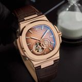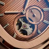 Mặt số màu nâu chocolate của 6312R/08 được hoàn thiện với họa tiết Teak (vân ngang) lấy cảm hứng từ những boong tàu hạng sang, tạo cảm giác phóng khoáng và đa chiều. Điểm nhấn đặc biệt nhất chính là sự xuất hiện của kim giây nhỏ (Small Second) đặt tại một sub-dial riêng biệt, kết hợp cùng ô Open Heart tại góc 9 giờ. Cách bố trí này không chỉ phô diễn nhịp đập của bộ máy cơ học mà còn tạo nên một bố cục cân đối, mang đậm hơi hướng của những cỗ máy thời gian cổ điển châu Âu.